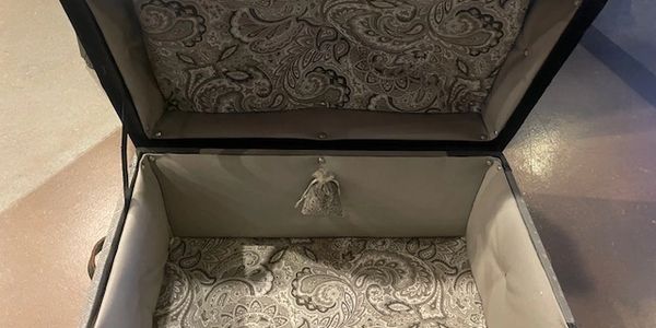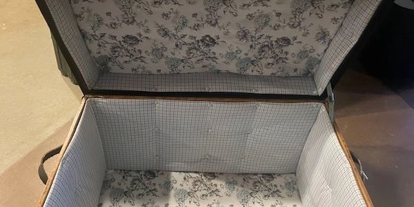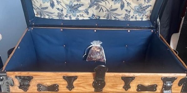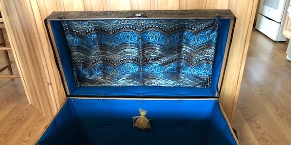 The inside has been cleaned and sealed with an odor blocking primer. The lower and upper parts of the trunk have been lined with batting and a beige upholstery fabric with blue flowers.