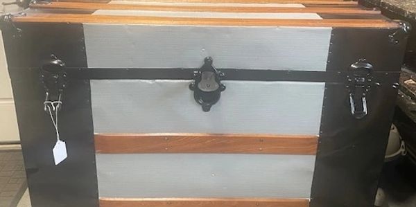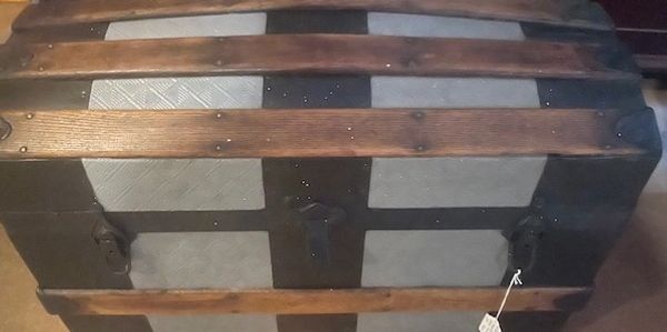 This cross-hatch embossed tin dome trunk was purchased in Sloansville, NY and measures 25-1/2"W x 14-1/2"D x 15-1/2"H. It has been painted gray with hardware and trim painted satin black. The oak slats have been sanded and polyurethaned. The handles have been replaced with Amish leather and the handle caps are new. There is no key available.