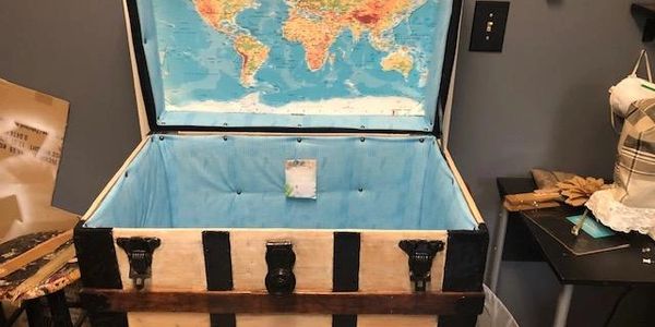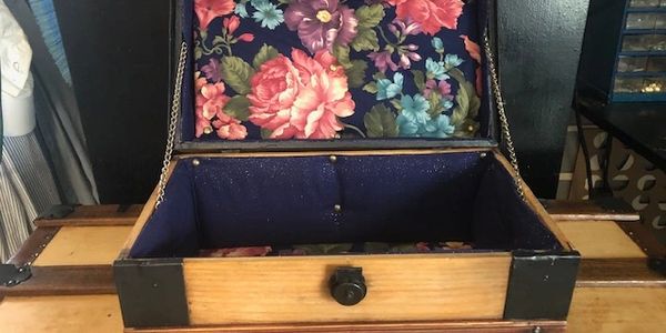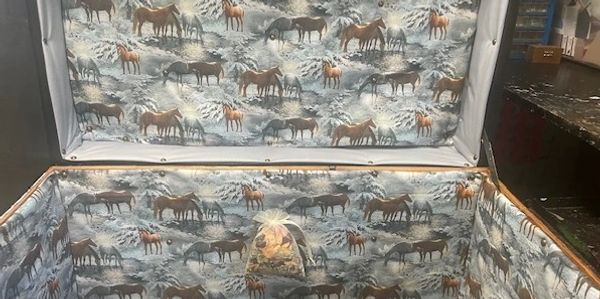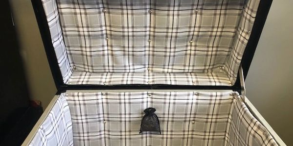 The inside has been cleaned and sealed with an odor blocking primer. It has been lined with batting and coordinating blue upholstery fabrics.