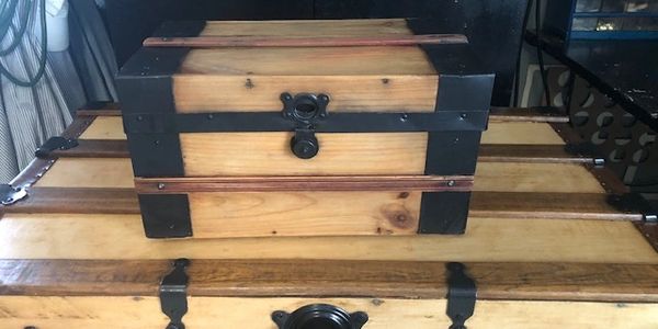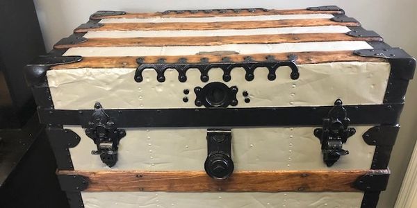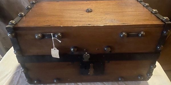 This flat-top box trunk measures 28"W x 17"D x 19"H. The original canvas covering has been stripped and the original wood sanded and polyurethaned. The hardware has been painted satin black and the handles have been replaced with Amish leather.