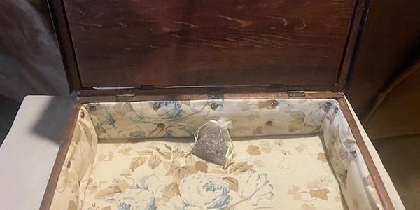 The inside has been stripped, cleaned and sealed with an odor blocking primer. It has been lined with fiberfill and a turquoise blue satin fabric and matching solid fabric.